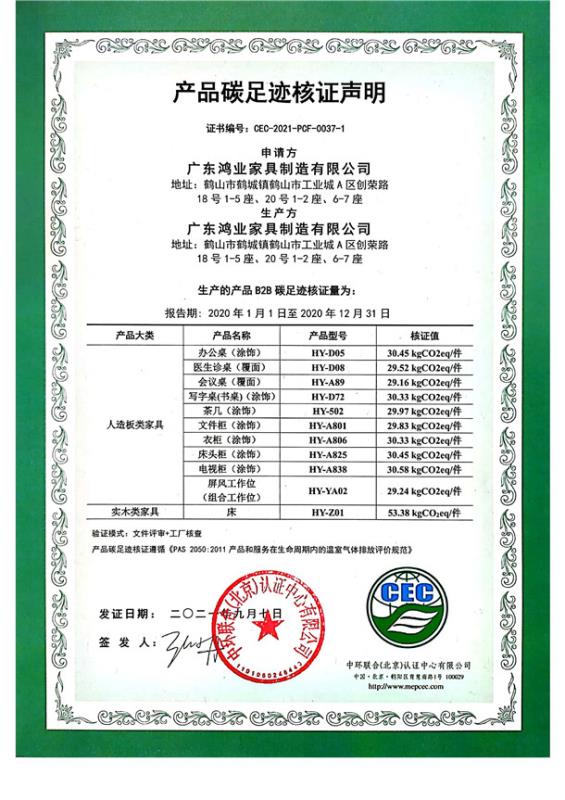 上一篇:廣東省鴻業(yè)家具制造有限公司碳足跡核證聲明-CEC-2021-PCF-0037-2-金屬類鋼木類綜 合類木家具