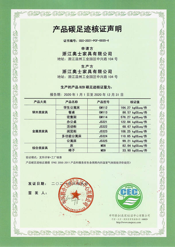 下一篇:浙江奧士家具有限公司-2021-PCF-0035-3-鋼木類家具