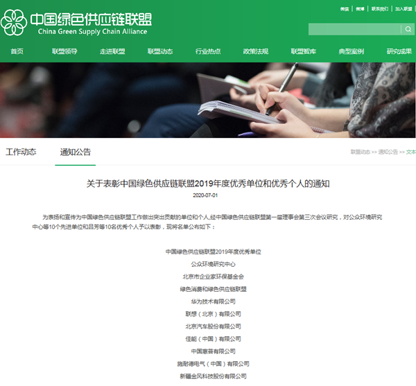 在中國共產黨成立99周年紀念的日子里,雙綠聯盟也迎來了好消息。7月1日,中國綠色供應鏈聯盟官網主頁發布了“關于表彰中國綠色供應鏈聯盟2019年度優秀位和優秀個人的通知”,雙綠聯盟榮獲“中國綠色供應鏈聯盟2019年度優秀單位”稱號。