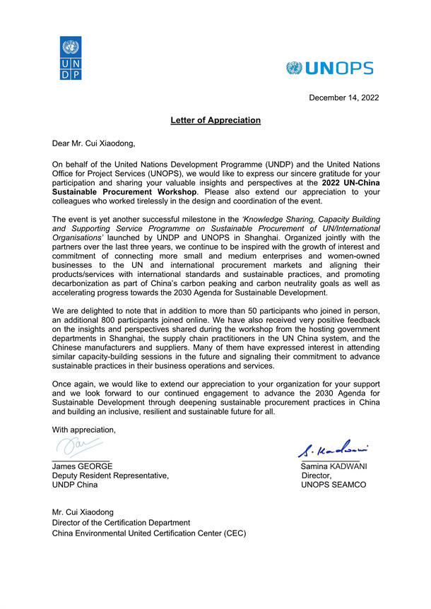 近日,聯(lián)合國開發(fā)計劃署和聯(lián)合國項目事務(wù)署向中環(huán)聯(lián)合認(rèn)證中心發(fā)來感謝信,對中環(huán)聯(lián)合認(rèn)證中心代表在2022年聯(lián)合國中國可持續(xù)采購研討會的精彩分享表示感謝,并希望以此為契機(jī),繼續(xù)深化合作交流,共同推進(jìn)2030年可持續(xù)發(fā)展議程,建設(shè)更包容、 強(qiáng)韌和可持續(xù)的未來。