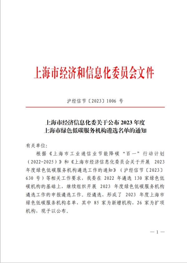 2023年11月20日,上海市經濟和信息化委員會發布了《上海市經濟信息化委關于公布2023年度上海市綠色低碳服務機構遴選名單的通知》(滬經信節【2023】1006號),中環聯合(北京)認證中心有限公司(以下簡稱CEC)成功入選,成為上海市碳管理、綠色評價、管理體系認證的第三方服務機構。