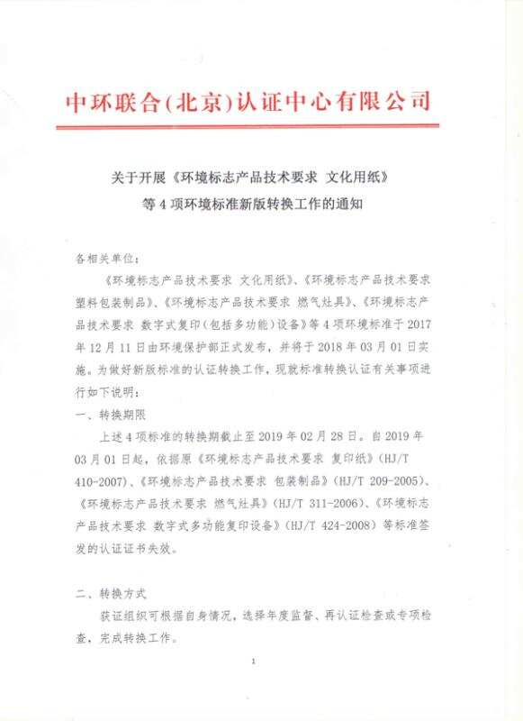 關于《環境標志產品技術要求+文化用紙》等4項國家環境保護標準轉換的通知)