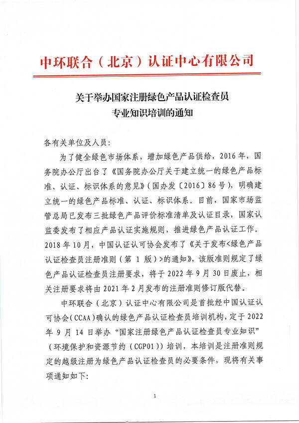 9月14日國家注冊綠色產品檢查員專業知識培訓通知