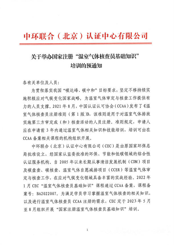 《關(guān)于舉辦國家注冊(cè)“溫室氣體核查員基礎(chǔ)知識(shí)”培訓(xùn)的預(yù)通知》
