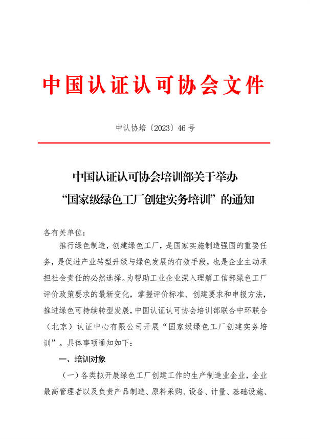 中國認證認可協會培訓部關于舉辦“國家級綠色工廠創建實務培訓”的通知